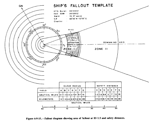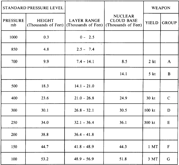 Message or Effective Downwind Message with which to work), fallout predictions are still possible. Effective downwind direction and speed can be computed using a pre-determined or an estimated weapon yield and wind data obtained from upper-air soundings.The use of standard-pressure-level winds to compute effective downwind data assumes that these winds represent mean winds for the layers of the atmosphere. Each standard pressure level applies to a certain layer of the atmosphere.See table 6-9-4. For example, the wind at 700 millibars is assumed to be the mean wind in the layer between 7,400 feet and 14,100 feet, and the wind at 500 millibars is assumed to be the mean wind for the layer from 14,100 feet to 21,000 feet. Table 6-9-4 also provides the nuclear-cloud-bottom parameters for the seven standard weapon yields (Alpha through Golf).The standard-pressure-level winds used to compute the effective downwind direction and speed for a given weapon yield are those winds representing the layers up to and including the height of the nuclear cloud base. In other words, if the nuclear cloud base is estimated to be at 30,000 feet, only those layers up to and including this height are used.Table 6-9-4.-Atmospheric Layers and Standard Pressure Levels: Cloud Base (Bottom) Parameters for the Seven Yield Groups