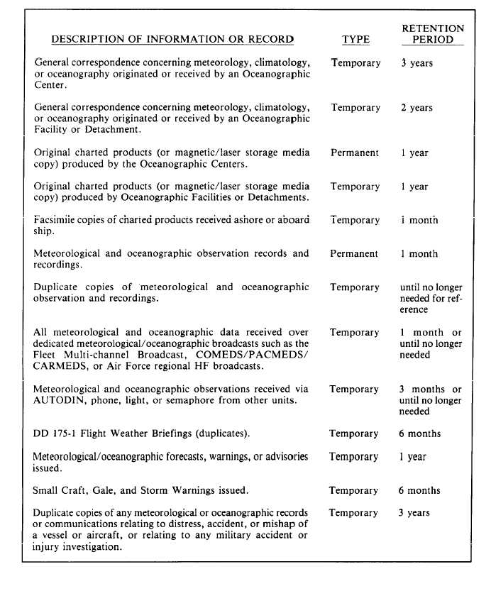 Disposal of Records and Files Table 7-1-1 lists different types of meteor-ological and oceanographic records, identifies the information as permanent or temporary, and lists the retention periods of the information as defined in SECNAVINST 5212.5C (as of 13 February 1989).Permanent records, with the exception of observation records, should be transferred to the Federal Records Center after the retention period has passed. Specific instructions for handling the transfer of meteorological and oceanographic observation records to the Climatic Records Center in Asheville, North Carolina, are provided in NAVOCEANCOMINST 3140.1, U.S. Navy Oceanographic & Meteorological Support System Manual.Temporary records and files should be properly disposed of or destroyed after the retention period has elapsed.MAINTAINING DIRECTIVES All Naval Oceanography Command units and all naval ships with Aerographers Mates receive and are required to maintain directives issued by the Commander, Naval OceanographyTable 7-1-1.-Retention Requirements for Meteorological and Oceanographic Records and Information