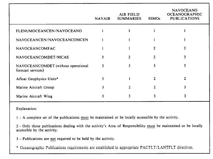 MAINTENANCE OF METEOROLOGICAL AND OCEANOGRAPHIC PUBLICATIONSSo far, we have discussed maintenance of files and directives. Two other administrative functions you may be asked to do are to maintain meteorological and oceanographic reference publications, and to maintain meteorological and oceanographic forms. Many of the NOC Centers and Facilities have a billet for an AG2 to be specifically designated as the Command Librarian or the Records Petty Officer. Maintenance of meteorological and oceanographic forms is a small task and is usually done by the operations assistant, sometimes an AG2.As you have probably discovered, every Geophysics Office, whether aboard ship or ashore, has many different reference publications available for use. Some offices routinely receive and maintain specialized magazines dealing with the sciences of meteorology and oceanography, such as Weatherwise or Meteorological Society. Oceanographic Command activity and every ship-boardGeophysics Office was issued many different NAVAIR publications. These are books published by the government or civilian publishing companies that the Naval Air Systems Command determined to be useful for reference. Other publications you might have in your office are equipment technical manuals and operator manuals that were issued with various pieces of equipment or with equipment systems.We can classify all the various types of publications into three groups: Required Publications, Allowed Publications, and useful publications.Required Publications Required publications are the hard- or soft-covered books that you must have on hand, as Table 7-1-2.-Required Publications for Meteorological and Oceanographic Support Activities